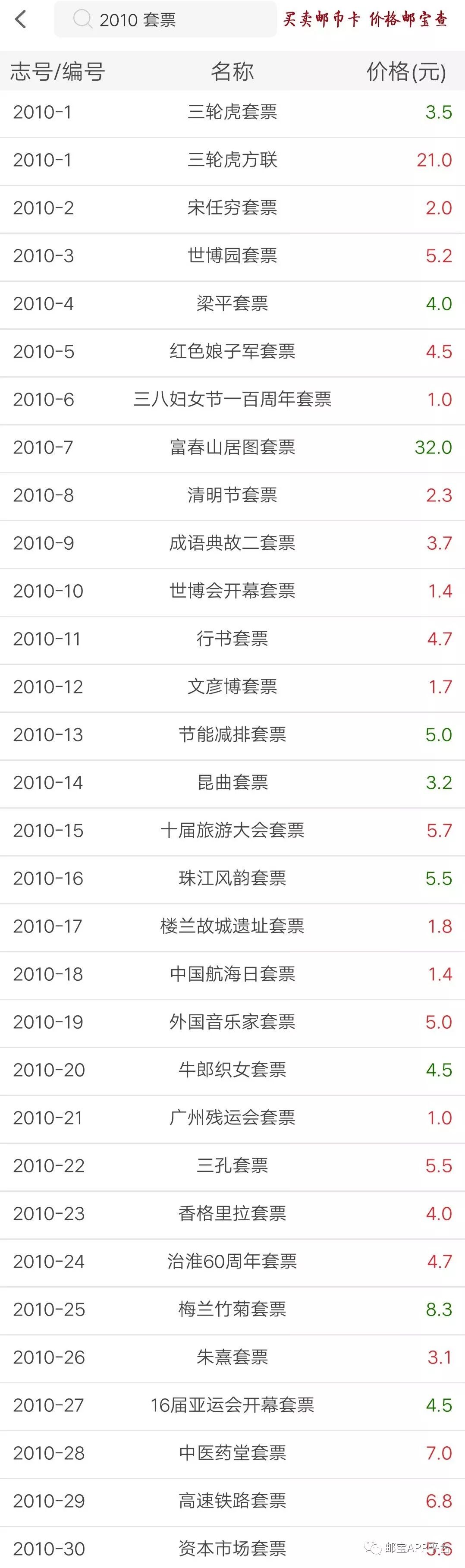 2010年套票产品价格如下